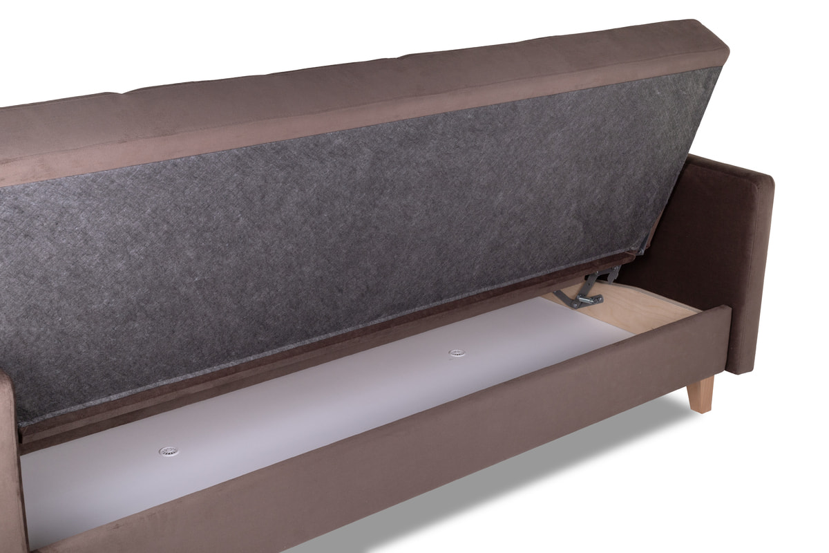 Вместительный бельевой короб внутри дивана с микропроветриванием отлично подходит для хранения белья или мелочей. Продуманная конструкция сидения с мягким валиком под колени и удобным выступом для легкой и удобной трансформации дивана.