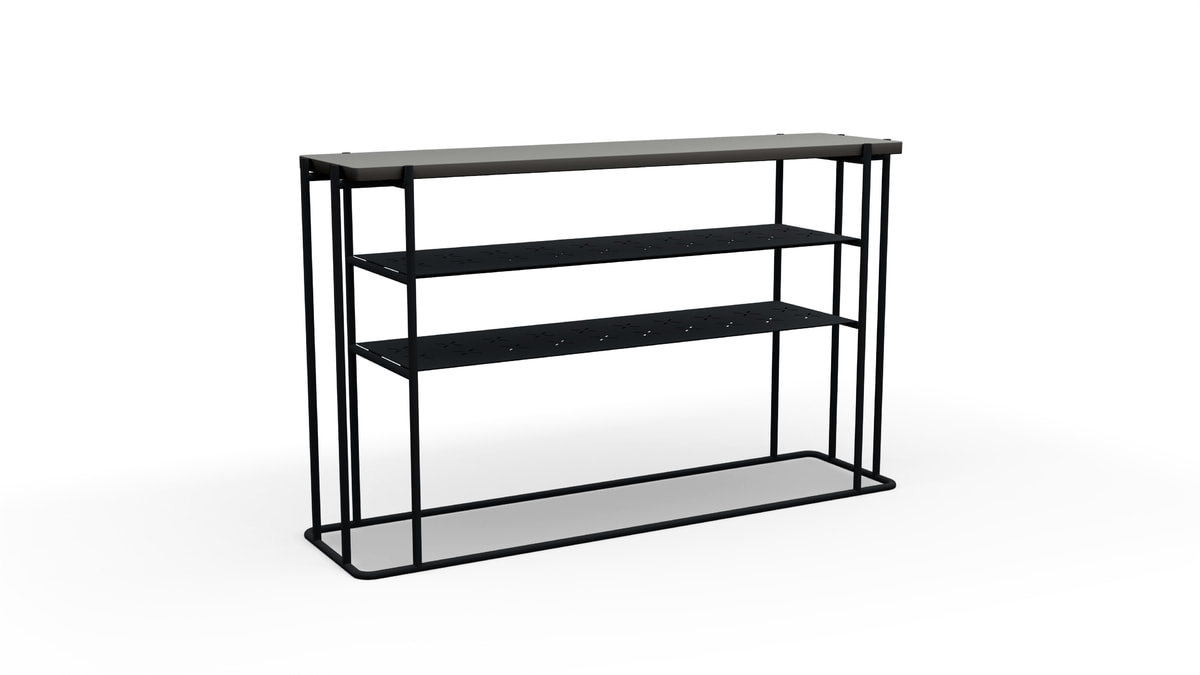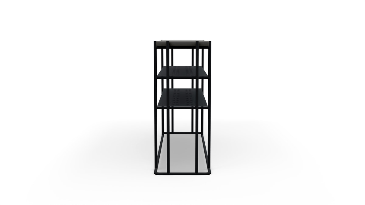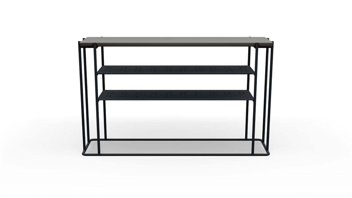 Полки консоли дополнены декоративной перфорацией. Стильный каркас в чёрном цвете и два варианта исполнения столешницы для сдержанного и современного интерьера.