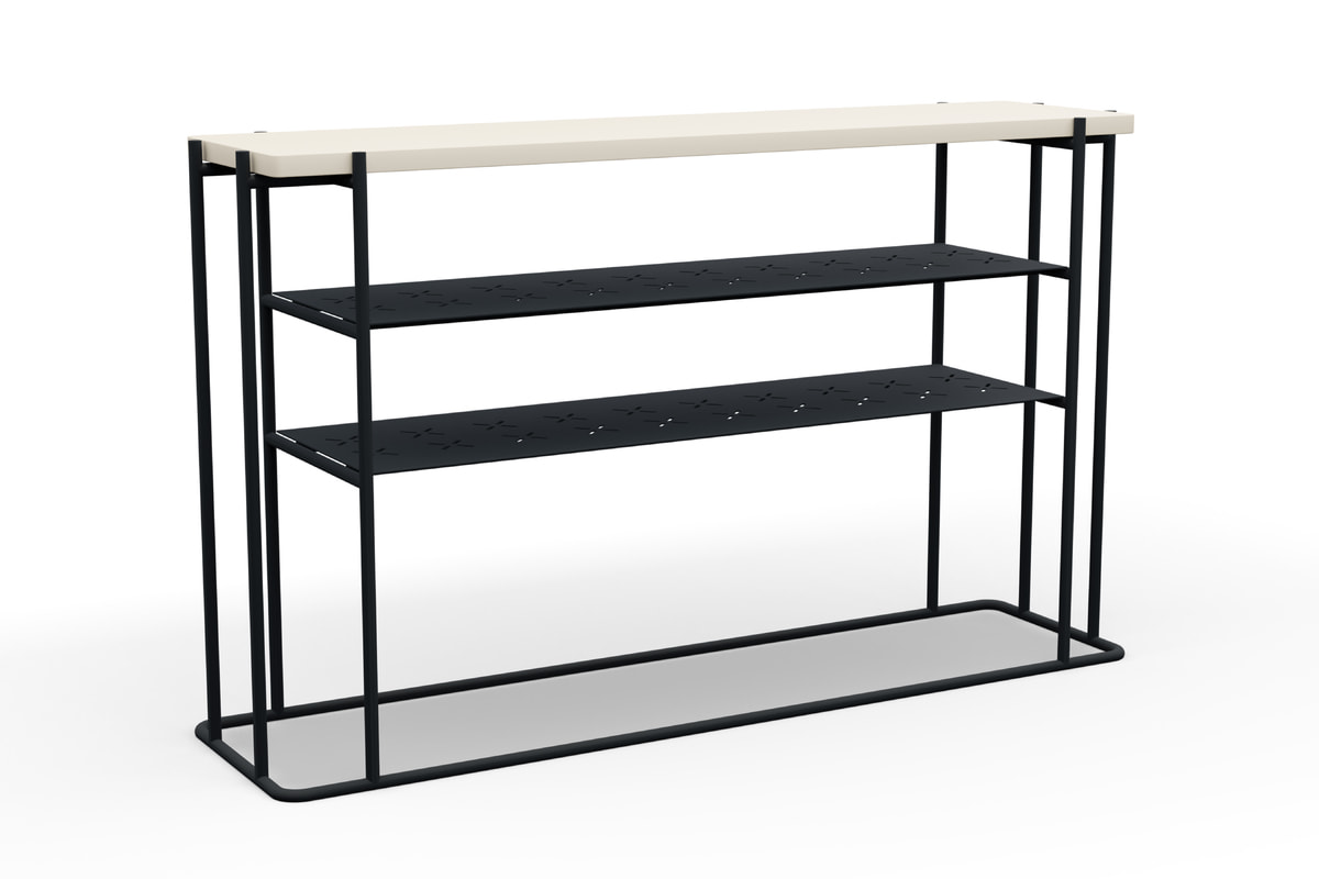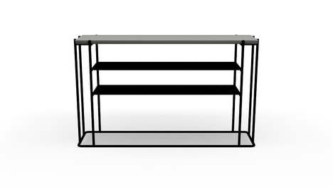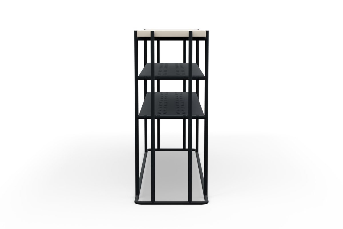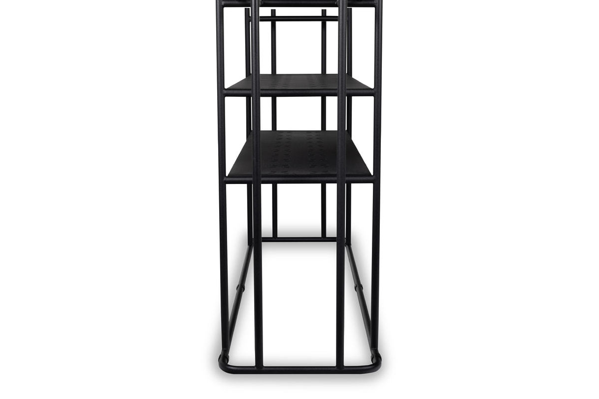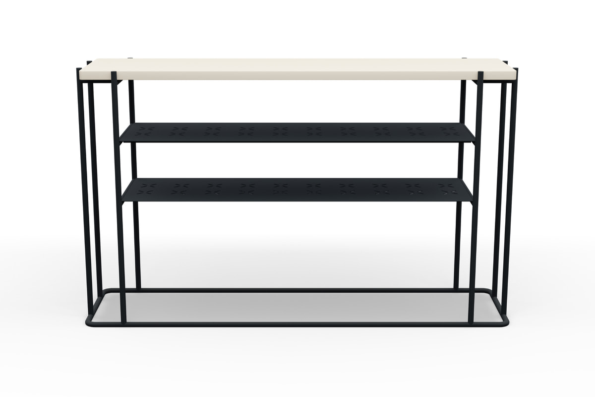 Полки консоли дополнены декоративной перфорацией. Стильный каркас в чёрном цвете и два варианта исполнения столешницы для сдержанного и современного интерьера.